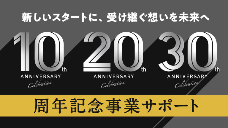 企業や店舗の周年記念は、その歴史を祝い、新たな未来への一歩を印象づける大切なイベントです。周年記念の訴求に必要な、社内/社外向けの様々なツールの制作をトータルでサポートいたします。
